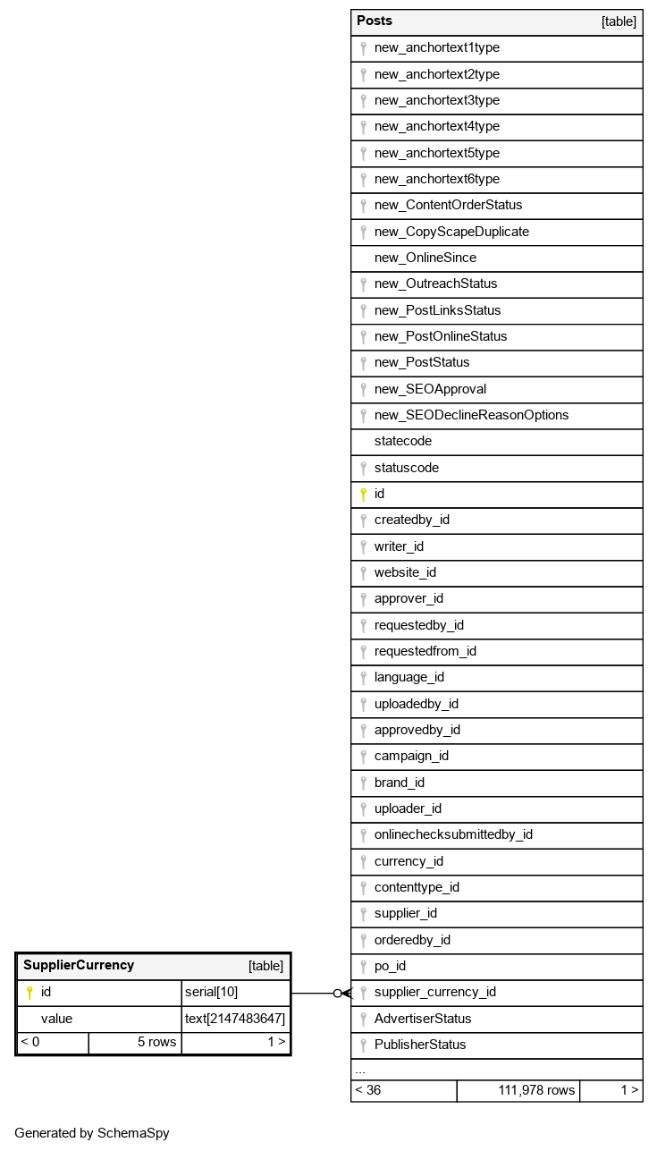 | SupplierCurrency_pkey | Primary key | Asc | id |